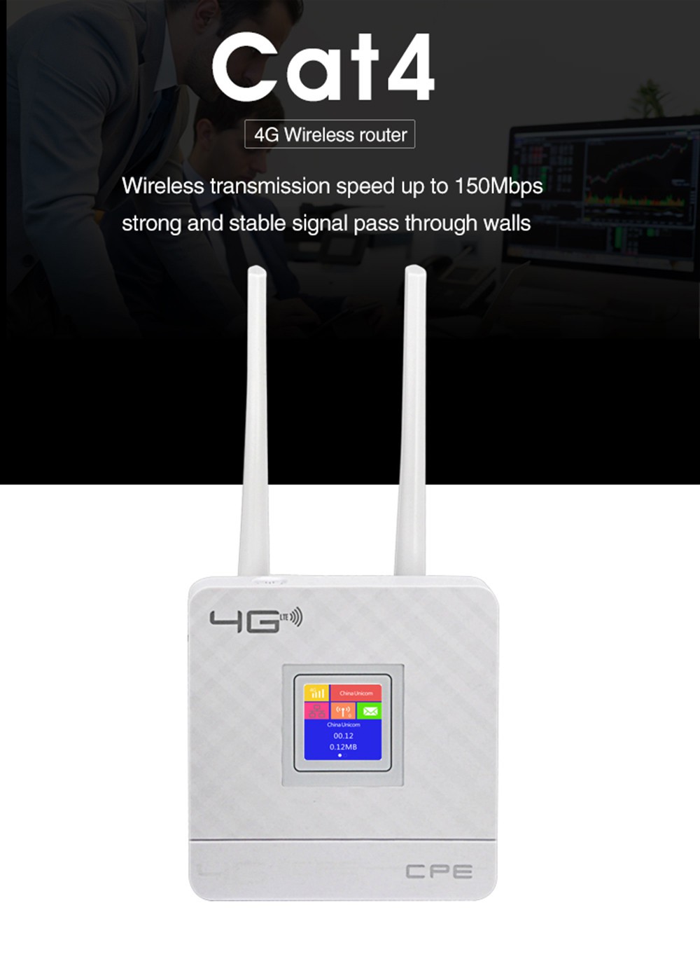 CPE903 is a high power 4G wireless router with 4G sim card slot and MIPS networking processor, it is a solution for enterprise, home, company, office's Wi-Fi networking. It's compatible with IEEE 802.11b/g/n standard, the data rate reaches to 300Mbps. With dual external antenna, Wi-Fi signal is more stable and longer range. It supports 10 Wi-Fi Users simultaneously.